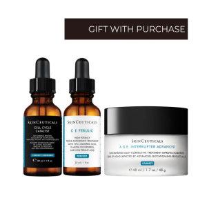 This trio takes the anti-aging benefits of the SkinCeuticals C E Ferulic Antioxidant Serum and A.G.E. Interrupter Advanced to new heights with the addition of the Cell Cycle Catalyst. Because the Cell Cycle Catalyst accelerates cell turnover, it improves the penetration of your products. This results in improved antioxidant protection as well as overall radiance and rejuvenation.