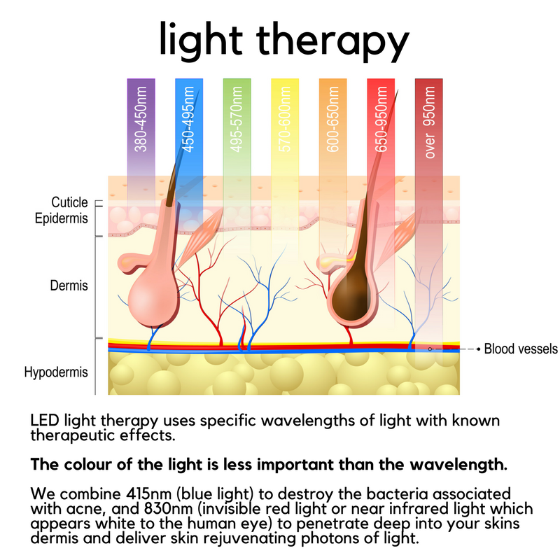 Light emitting diode (LED) light therapy is growing in popularity in clinic. Using varying LED wavelengths, this skincare technique purportedly helps: